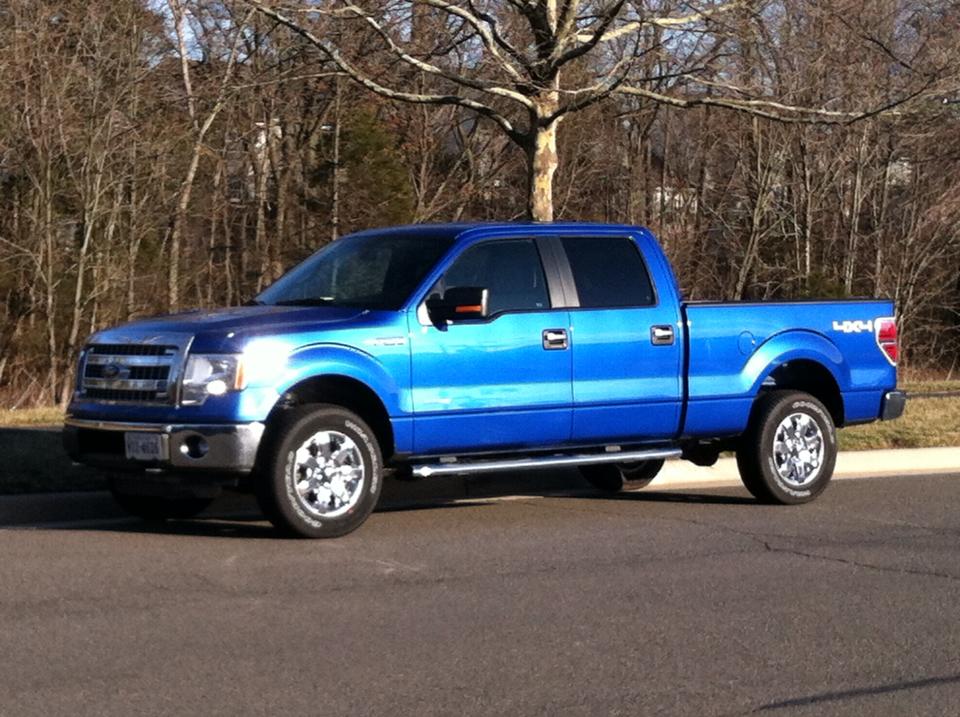 After a couple hours of being beaten up over the trade and us beating them up for better values on the trade and truck, a deal couldn't be made. We were feeling bad and wanted to leave to get some dinner and re-evaluate our budget. They wanted to "meet their sales numbers" for the day and "we were the last sale of the day." Likely stories. They just wanted our money. Our sales lady worked her butt off digging through the dealers inventory to find a truck that met our needs at a lower cost. I was set on the color, Super Crew cab and 4x4. She was able to find a F-150 XLT, Super Crew, 4x4 with front bucket seats and in Blue Flame. The bad part was it was at their other location and had to be brought to our dealer. We waited around for the lady to go to that dealer and bring the truck back. We wanted to check it out before finalizing the deal. It turned out to be a great truck without all the bells and whistles of the FX4 we started with: power everything, no leather, no touch screen, no sunroof. But we did get the Chrome Package, very nice tan and charcoal interior, power sliding rear window, XLT Plus package and a 6.5' bed with the tailgate step. We finalized the deal and I drove the truck home after 9pm on Sunday.